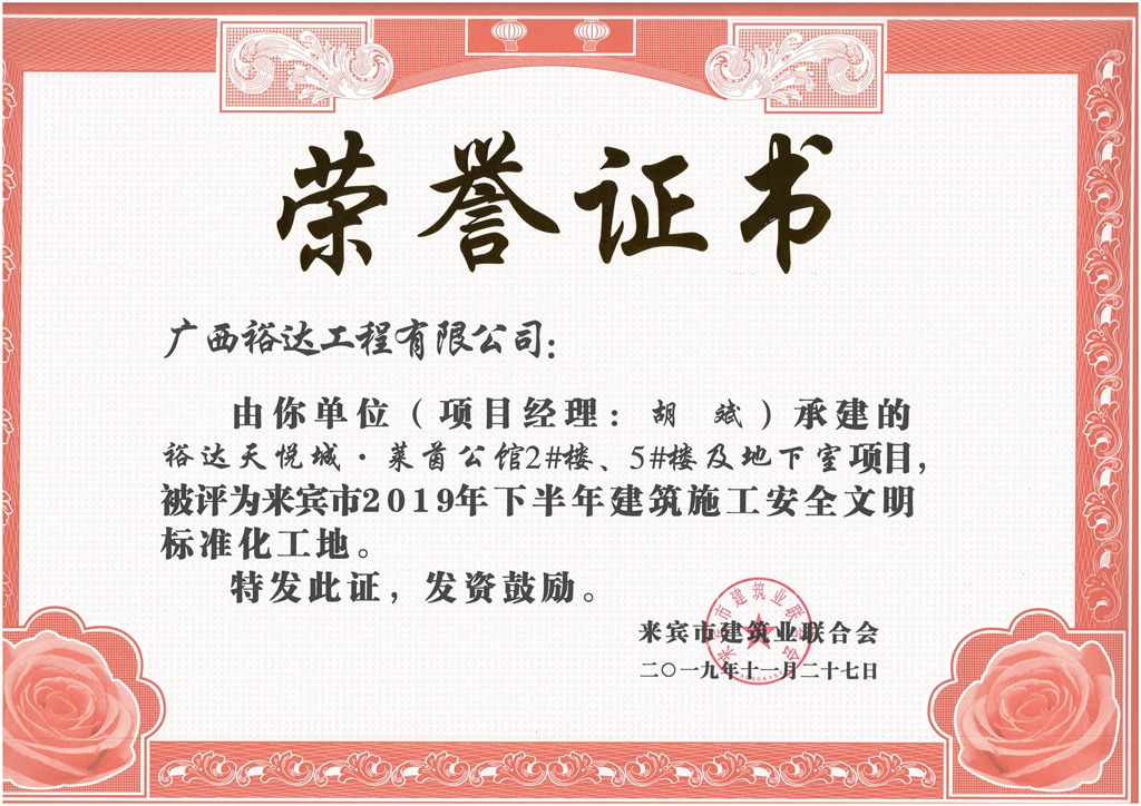 裕达天悦城·莱茵公馆2#、5#楼及地下室被评为来宾市2019年下半年建筑施工安全文明标准化工地(项目经理:胡斌)