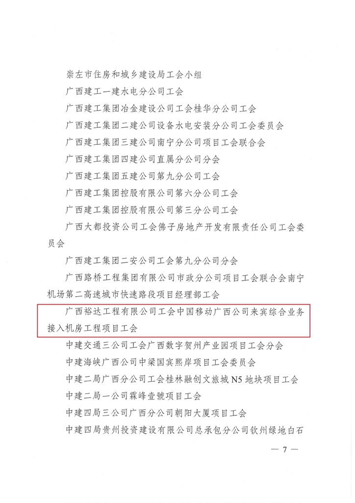 近日,从自治区住建厅及自治区总工会获悉,工程公司自营项目中国移动广西来宾综合业务接入机房工程(简称“移动项目”)再获表彰,荣获“2020年度全区重点工程建设示范性劳动和技能竞赛优胜班组”和“2020年度全区住房城乡建设系统先进职工小家”荣誉称号。