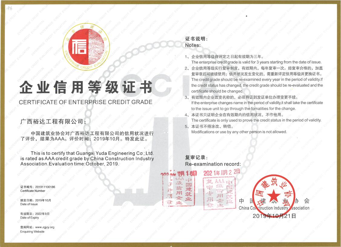 公司2019年获得AAA级信用企业证书。今年信用评级是以各企业2020年度公司诚信经营业绩、质量安全管控情况等为考核期主要评价指标。在考核期内工程公司表现优秀经评审通过 AAA级复审。这是对公司信誉、实力和形象的肯定标志着公司在企业信用建设中取得了优异的成绩公司的素质诚信度高,各项指标优秀,诚信意识强、经营状况好、履约能力强、社会信誉好品牌形象已具备一定的市场竞争力
