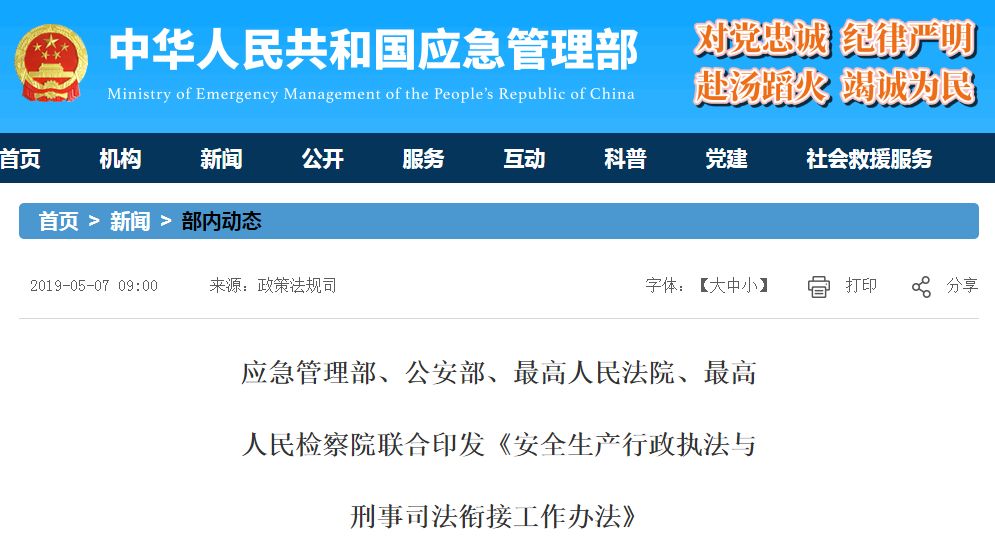 为贯彻落实《中共中央 国务院关于推进安全生产领域改革发展的意见》要求,建立健全安全生产行政执法与刑事司法衔接工作机制,依法惩治安全生产违法行为,保障人民群众生命财产安全和社会稳定,应急管理部、公安部、最高人民法院、最高人民检察院日前联合印发《安全生产行政执法与刑事司法衔接工作办法》。