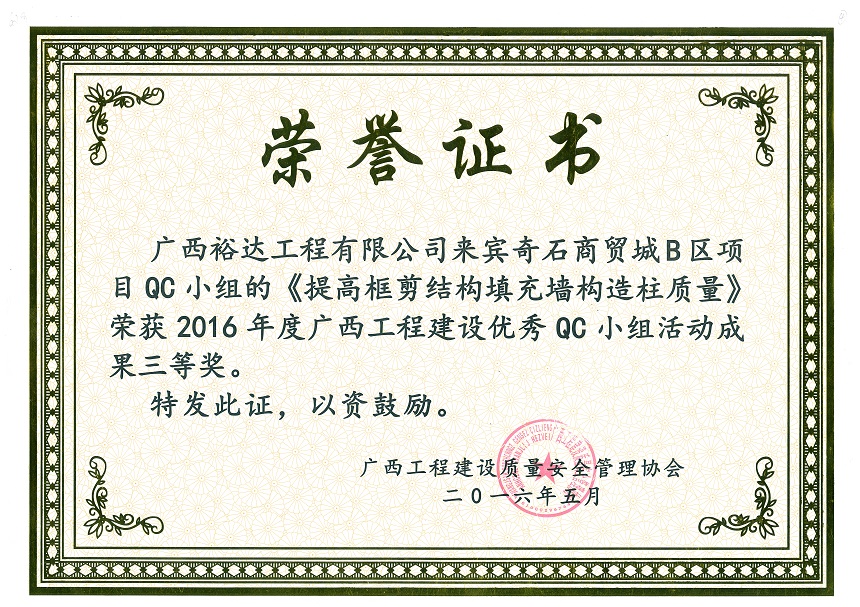 2016年度广西工程建设优秀QC小组活动成果三等奖《提高框剪结构填充墙构造柱质量》-来宾奇石商贸城B区项目