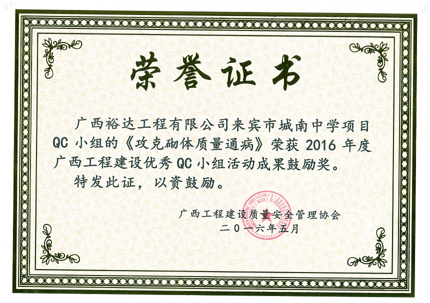2016年度广西工程建设优秀QC小组活动成果鼓励奖《攻克砌体质量通病》-来宾市城南中学项目