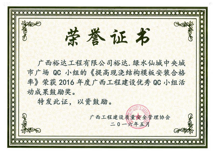 2016年度广西工程建设优秀QC小组活动成果鼓励奖《提高现浇结构模板安装合格率》-绿水仙城中央城市广场