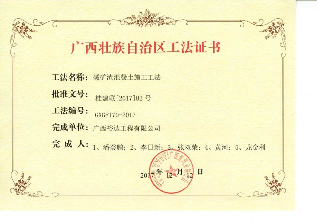 2017年广西壮族自治区工法证书(碱矿渣混凝土施工工法证书)
