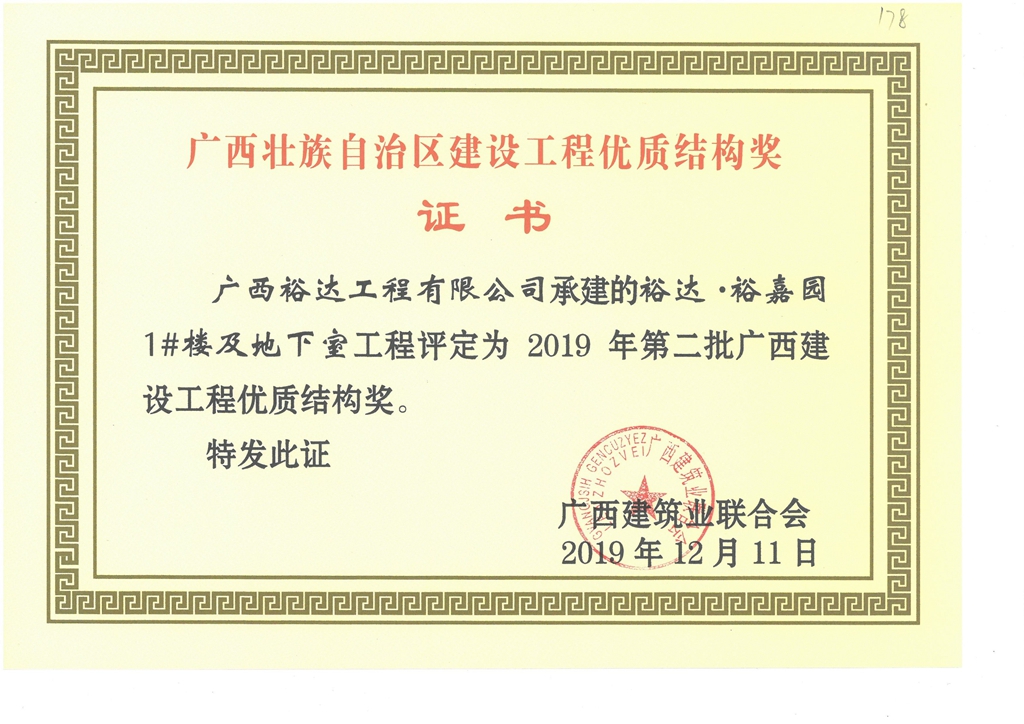 裕达·裕嘉园1#楼及地下室工程评定为2019年第二批广西建设工程优质结构奖